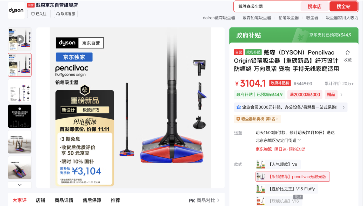 想要及时省心清洁地面,戴森Pencilvac Origin铅笔吸尘器少不了。机身仅38毫米粗细、0.92kg重量,灵活易用。马达转速高达14万转/分钟,除尘率达99%,四锥万向吸头不易缠绕,搭配免打孔磁吸充电底座,收纳充电一步到位。京东11.11下单享限时10%国补,到手价3104.1元。