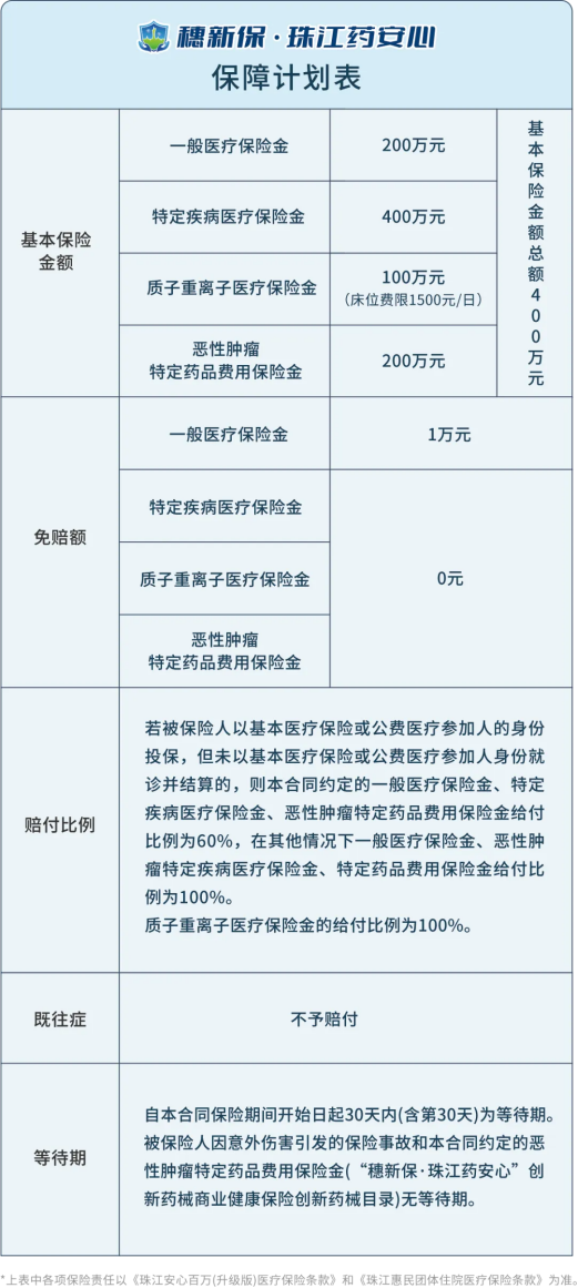 珠江人寿保险股份有限公司“穗新保・珠江药安心”构建了“基础医疗+创新药械+先进疗法”的三重保障体系,总保额高达400万元,全面覆盖就医全流程费用。