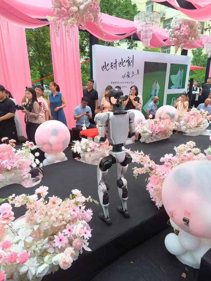 新郎是一对程序员夫妇,他们说:“我们不想婚礼只是吃饭敬酒。当机器人端着戒指走向我们的时候,全场宾客都在惊呼。那一刻,我知道这就是我们想要的——它不只是环节,更是我们对未来生活的想象。”