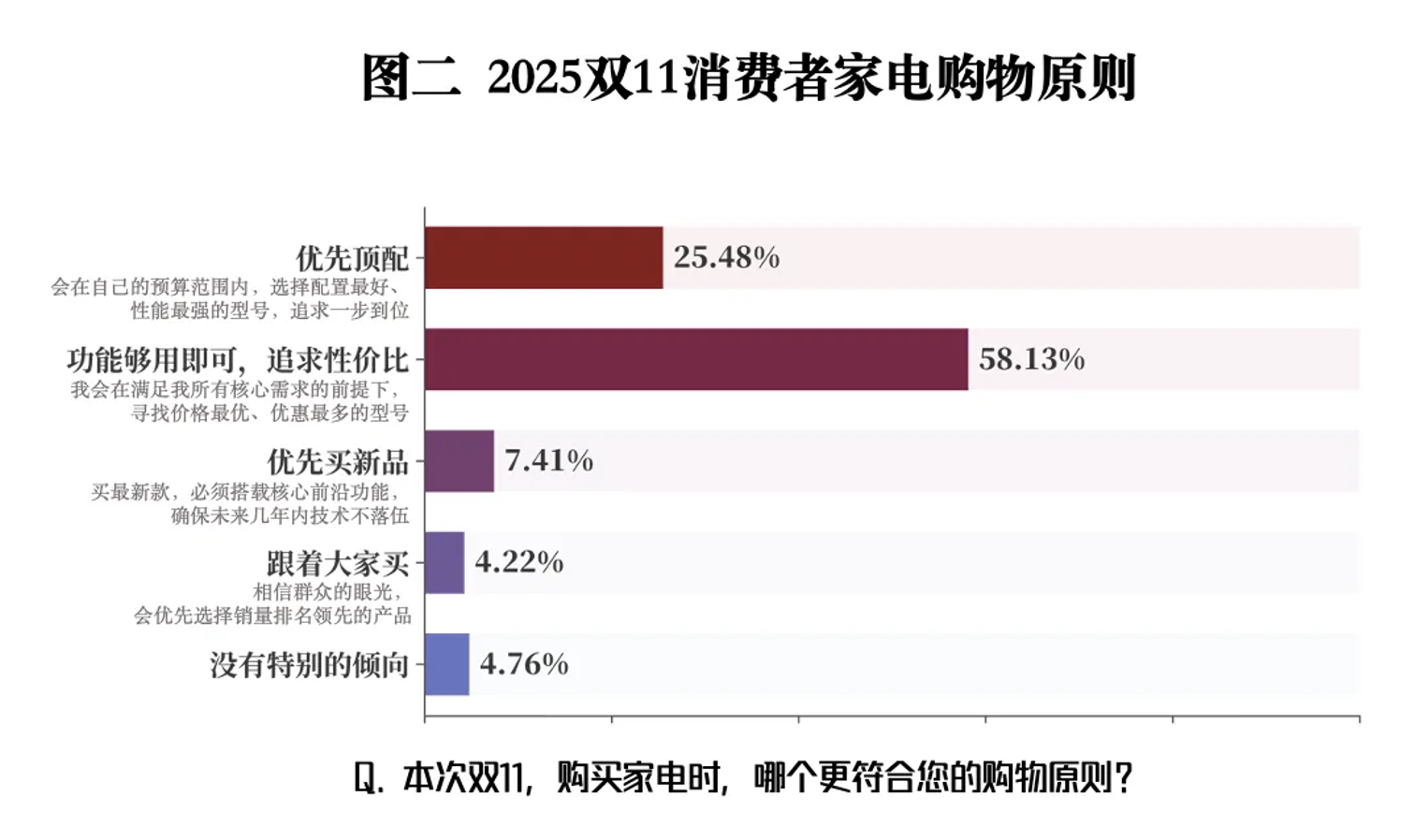 本次调研还勾勒出当前家电消费的两大核心群体。“务实族”占比58.13%,坚持“功能够用即可”,追求极致性价比;“顶配族”占比25.48%,认为家电是长周期使用产品,应在预算范围内选配置最好、性能最强的型号。