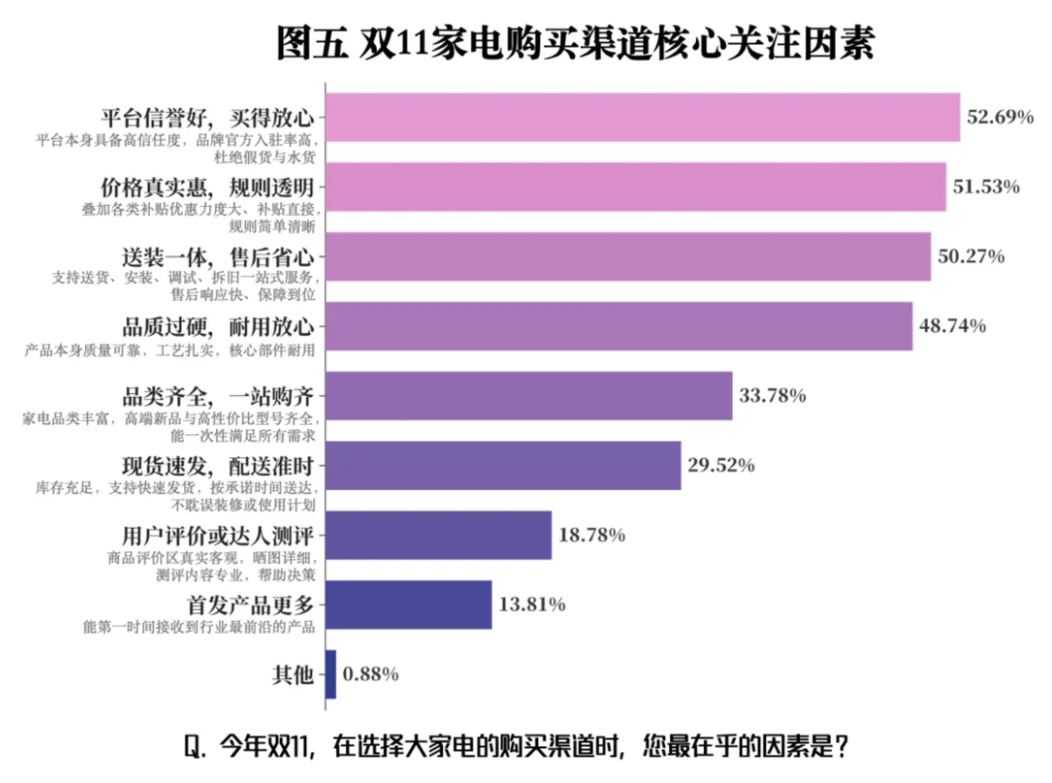 尽管消费理念不同,但消费者在选择平台时表现出高度共识。52.69%的受访者将“平台信誉好,买得放心”视为核心考量。价格实惠同样是消费者关注的重点,51.53%的受访者将其作为选择平台的关键因素。