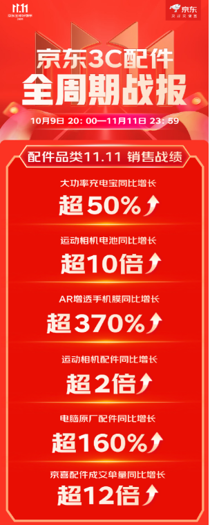 在3C数码产品深度融入大众生活的当下,市场对3C配件的需求呈大幅增长态势,消费者对高性能、多功能配件的追求也愈发旺盛。京东11.11期间,3C数码配件品类展现出强劲的增长势头。战报数据显示,11.11期间大功率充电宝成交额同比增长50%;运动相机电池成交额同比增长超10倍;运动相机配件成交额同比增长超2倍,电脑原厂配件成交额同比增长超160%;京喜配件成交单量同比增长超12倍。