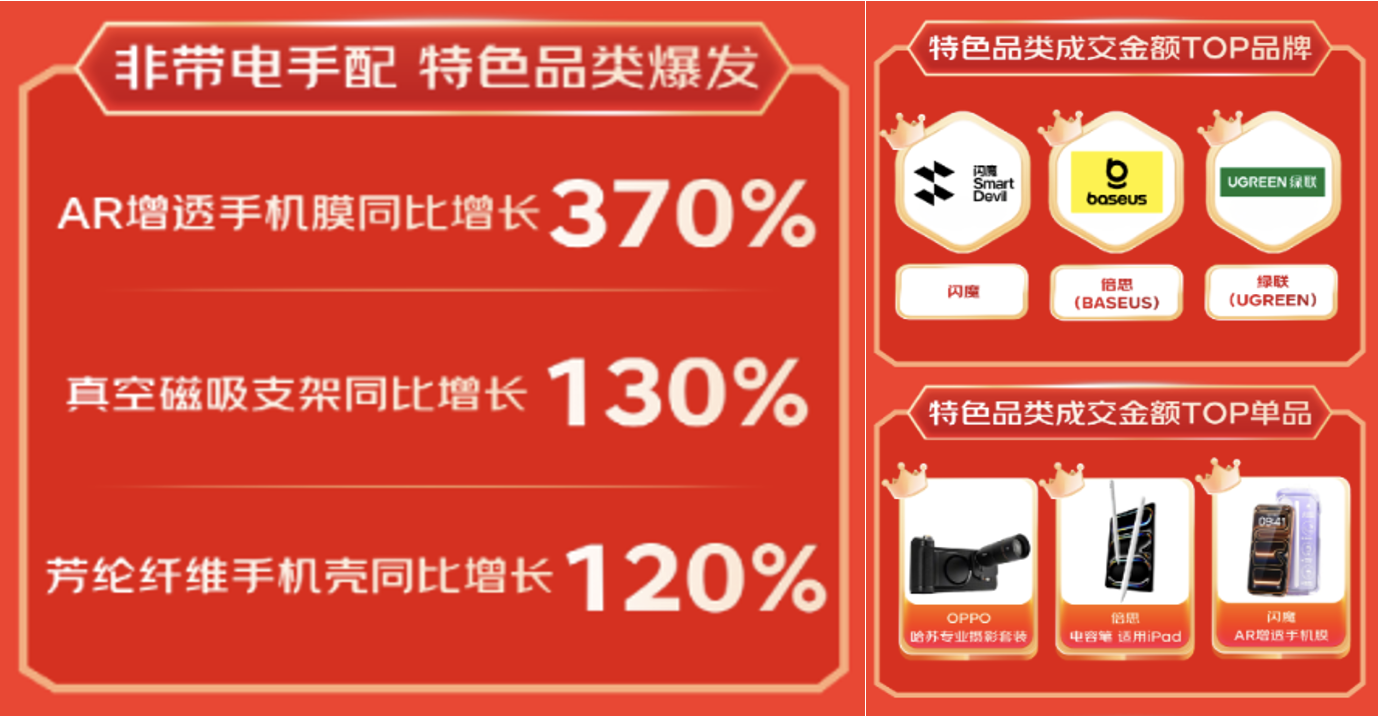 在非带电手配品类中,消费者更关注产品的便捷性与品质。AR增透手机膜成交额同比增长370%,真空磁吸支架成交额同比增长130%,芳纶纤维手机壳成交额同比增长120%。闪魔、倍思、绿联位列该品类销量前三,OPPO哈苏专业摄影套装、倍思平板触控iPad电容笔、闪魔AR增透手机膜成为热销单品。