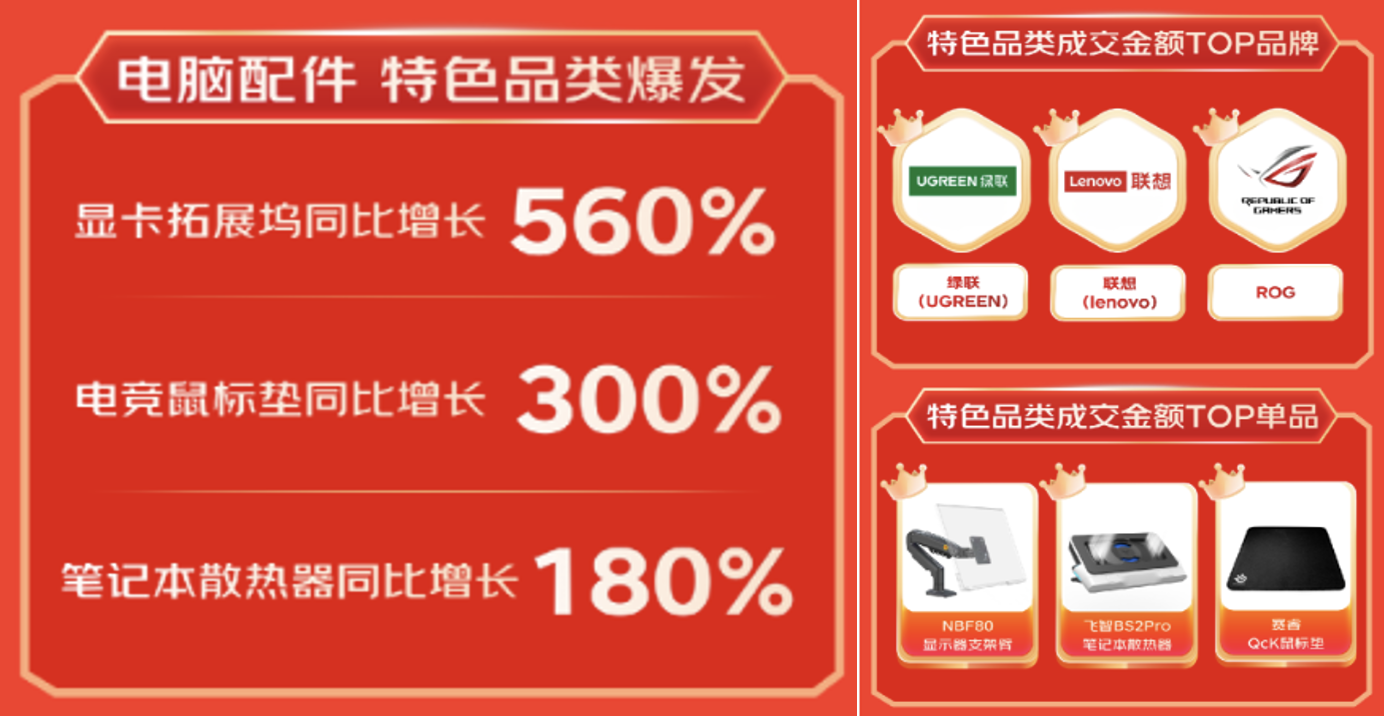 电脑配件品类中,显卡扩展坞成交额同比增长500%,电竞鼠标垫成交额同比增长300%,笔记本散热器成交额同比增长180%。绿联、联想、ROG等品牌占据市场主导地位,NBF80显示器支架臂、飞智BS2Pro笔记本散热器、赛睿QcK鼠标垫等单品销售火爆,显示出用户对高性能电脑配件的高度青睐。