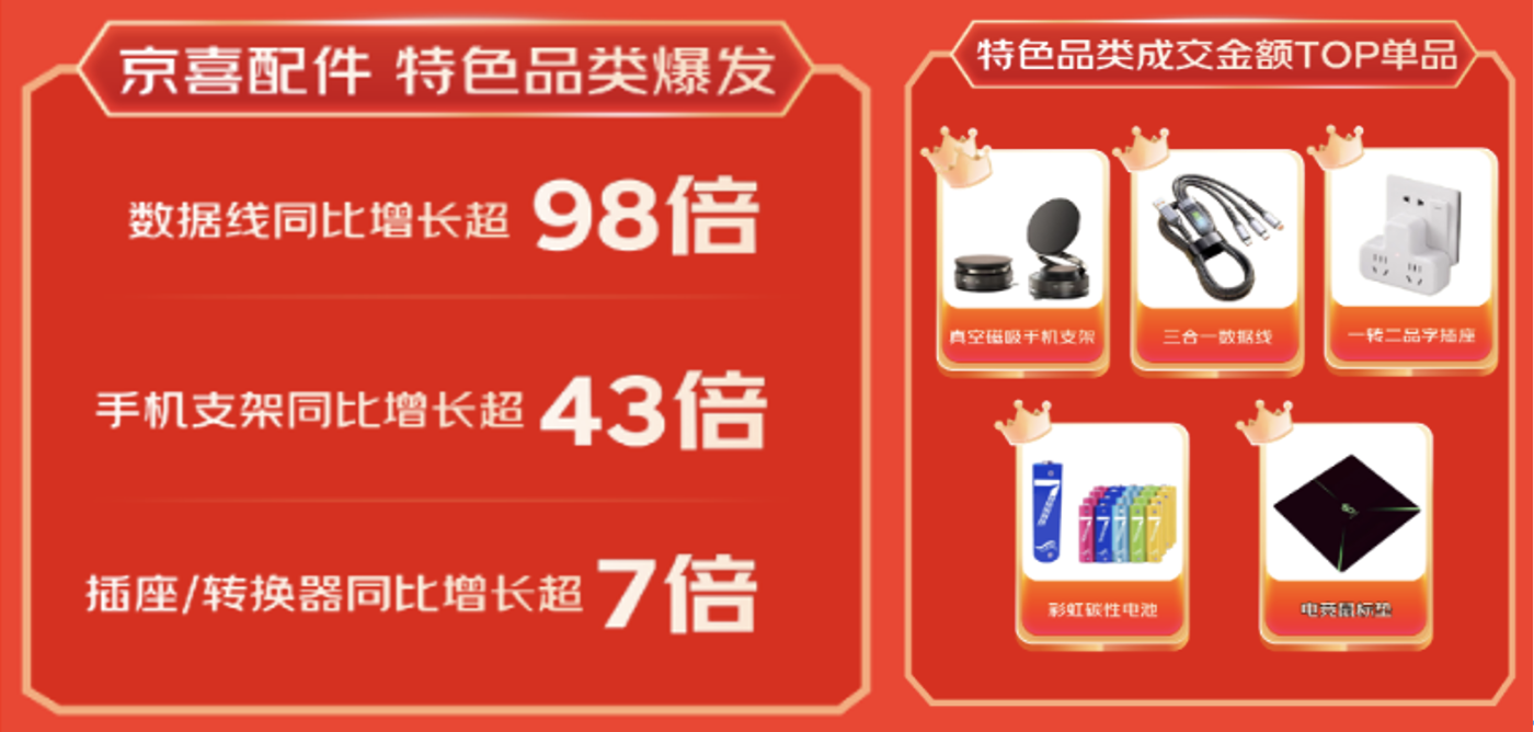 京喜配件在11.11全周期同样表现优异,数据线成交额同比增长超98倍,手机支架成交额同比增长超43倍,插座/转换器成交额同比增长超7倍。京喜真空磁吸手机支架、三合一数据线、一转二品字插座、彩虹碳性电池及电竞鼠标垫成为最畅销的单品。