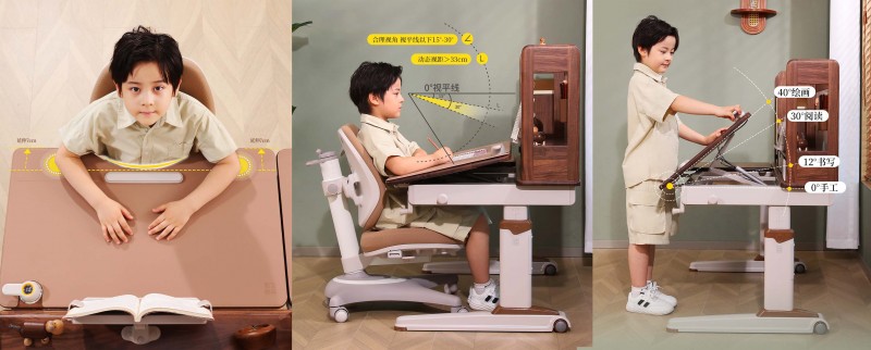 角度可视化,习惯成自然:0°手工、12°写字、30°阅读、40°绘画——清晰标识让孩子自主调节,在不同场景中养成正确坐姿肌肉记忆。