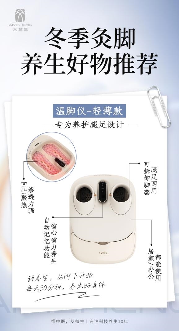 无论你是日常久坐、冬季手脚寒凉的办公室白领,还是关注足部暖养的中年亚健康人群,或是长期受风湿不适、腿脚寒凉困扰的老年群体,都可以通过艾益生这两款功能强大的科技温脚仪轻松获得暖脚、灸脚的养生体验——每天温暖一刻,帮助自己和家人祛风散寒,缓解冬季足部寒凉感,助力改善睡眠质量,为日常养生增添一份暖意。